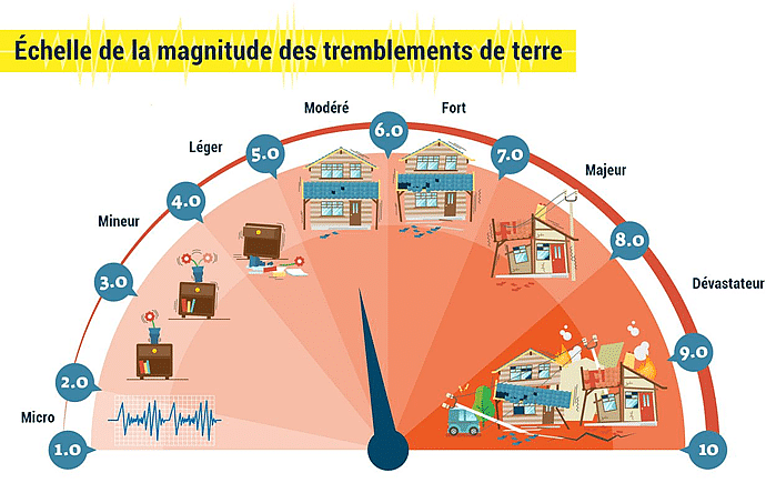 • Supérieur à 9 : séismes dévastateurs, zones complètement détruites sur des centaines de km, dommages sur plus de 1000 km, 1 à 5 par siècle