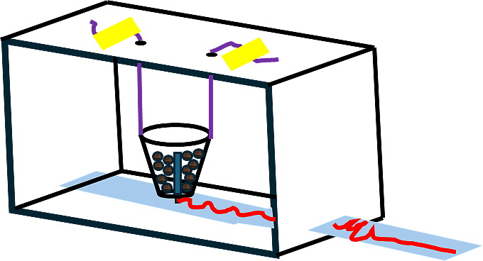 • Attacher deux ficelles au gobelet puis faire passer les brins à travers les trous de la boite (les brins doivent être verticaux) et les rendre solidaires de la boite de façon à ce que le fond du gobelet soit à quelques centimètres du fond de la boite